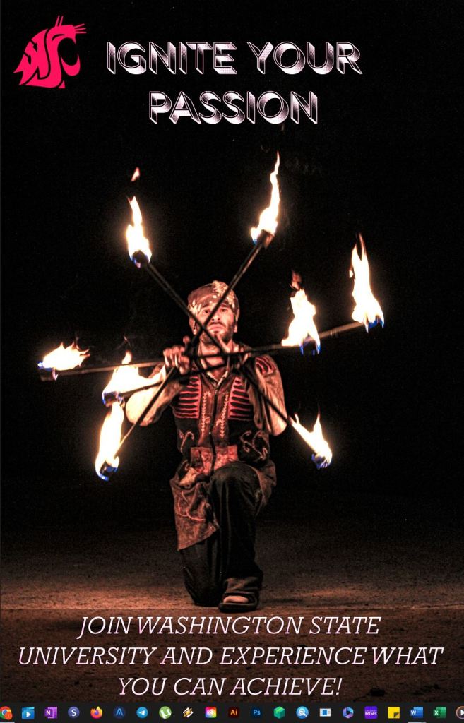 Project title: WSU FlyerBrief description: Why you should choose WSU flyerDate: sep 21st, 2023Programs Used: IllustratorA couple of highlights of what you learned in that project:Utilizing typography, using logos, promoting, and flyer design